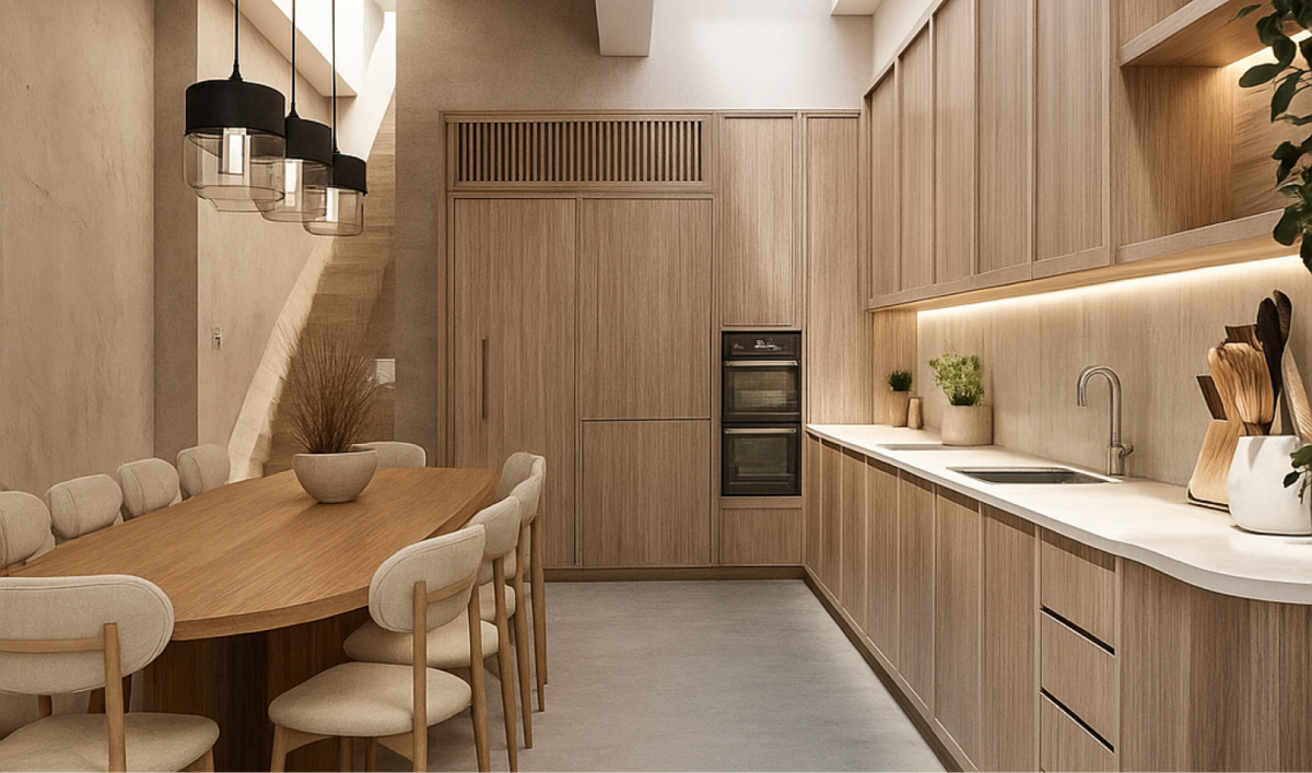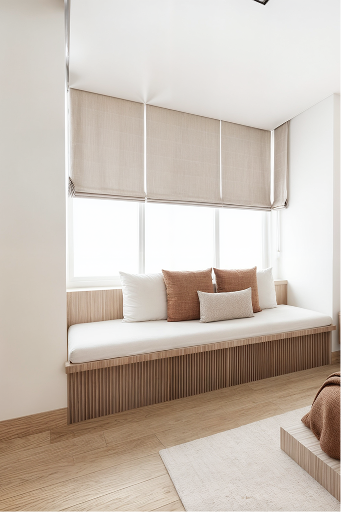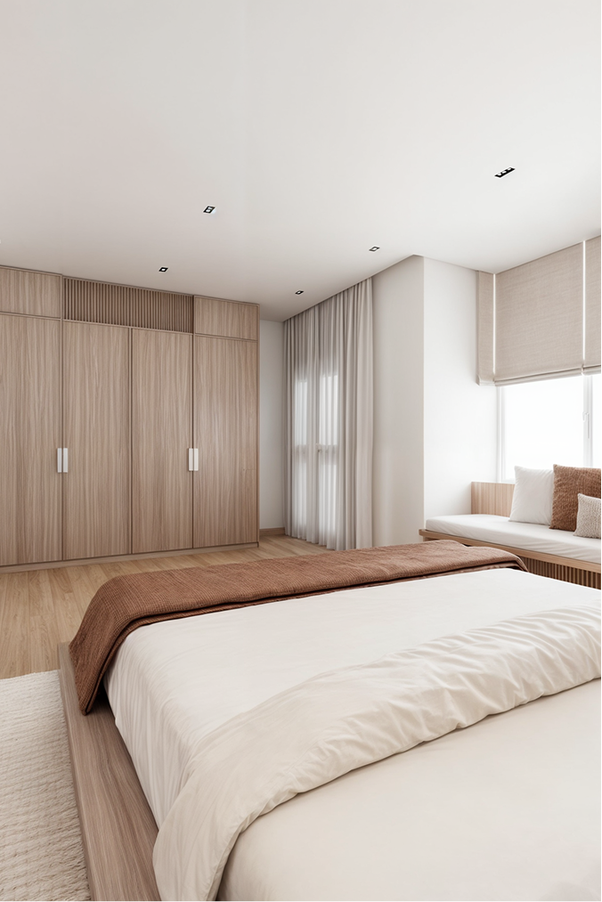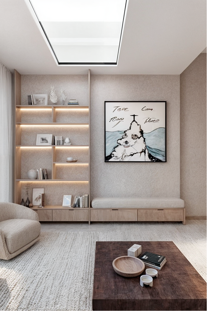 This five-bedroom terraced house, located in one of London’s most sought-after neighbourhoods, was designed to reflect a refined balance of contemporary style and comfort. The interiors draw inspiration from Japandi influences, featuring a soft, calming palette layered with warm accents to create a sense of serenity and wellbeing.